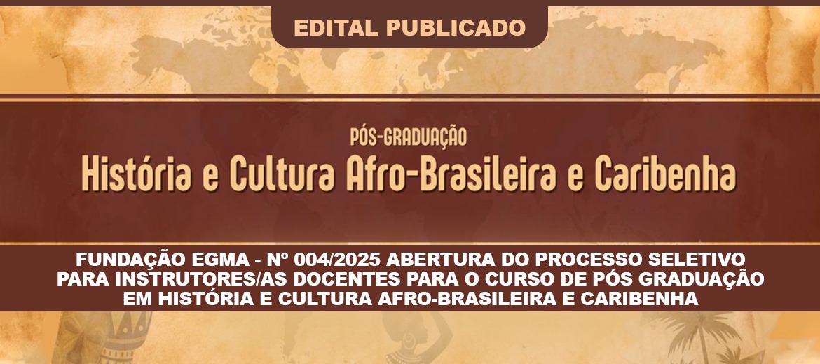 A Fundação Escola de Governo do Maranhão (EGMA) publicou nesta segunda-feira (22) o Edital nº 004/2025, que abre processo seletivo para a contratação de instrutores(as) docentes que irão atuar no curso de Pós-Graduação em História e Cultura Afro-Brasileira e Caribenha. link do edital -> EDITAL Nº 004/2025